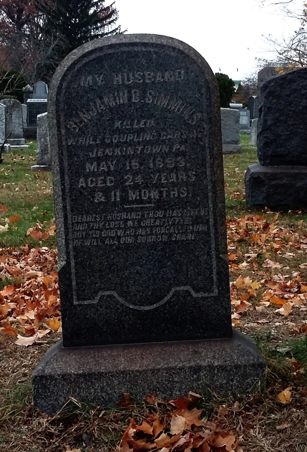On May 15, 1893, while working on the Philadelphia and Reading Railroad at a suburban Philadelphia station, Benjamin D. Simmins (1868-1893), just one month shy of his 25th birthday, was “Killed while coupling cars at Jenkintown, Pa.” as the inscription on his black granite gravemarker records.